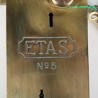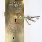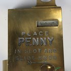 An Etas No. 5 brass toilet door lock, detailed 'Place Penny in Slot and Slide Knob', length 32cm.