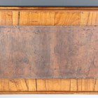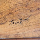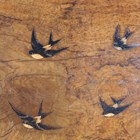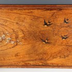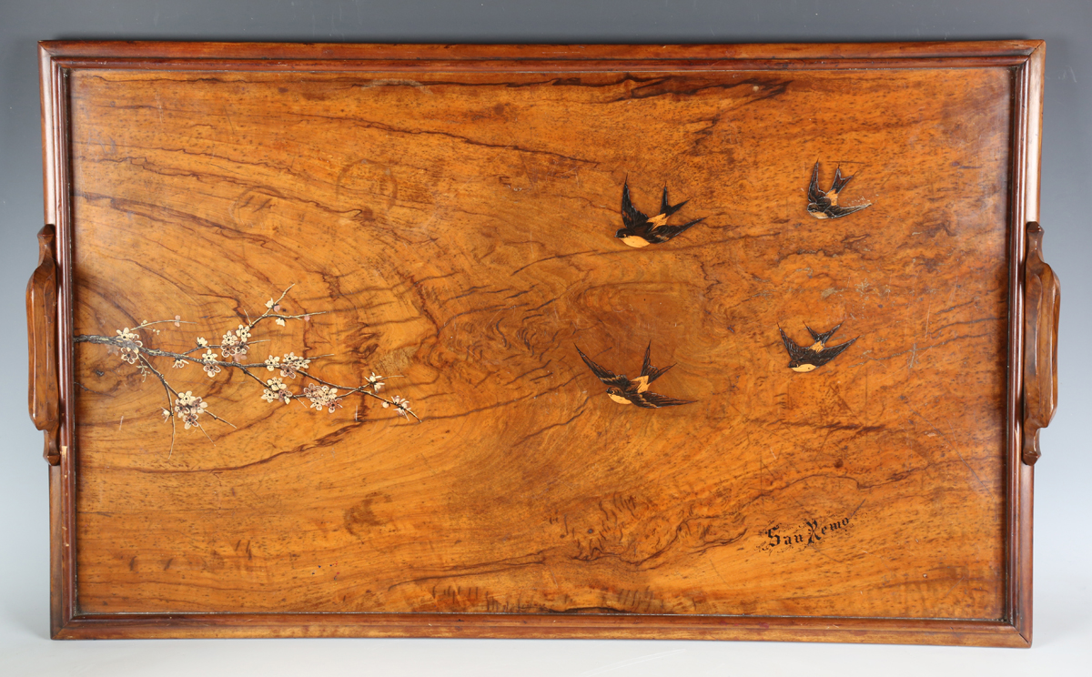 A large early 20th century Sorrento ware olive wood tea tray, inlaid with swallows and inscribed 'San Remo', width 81cm.