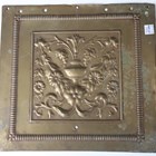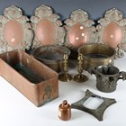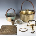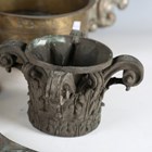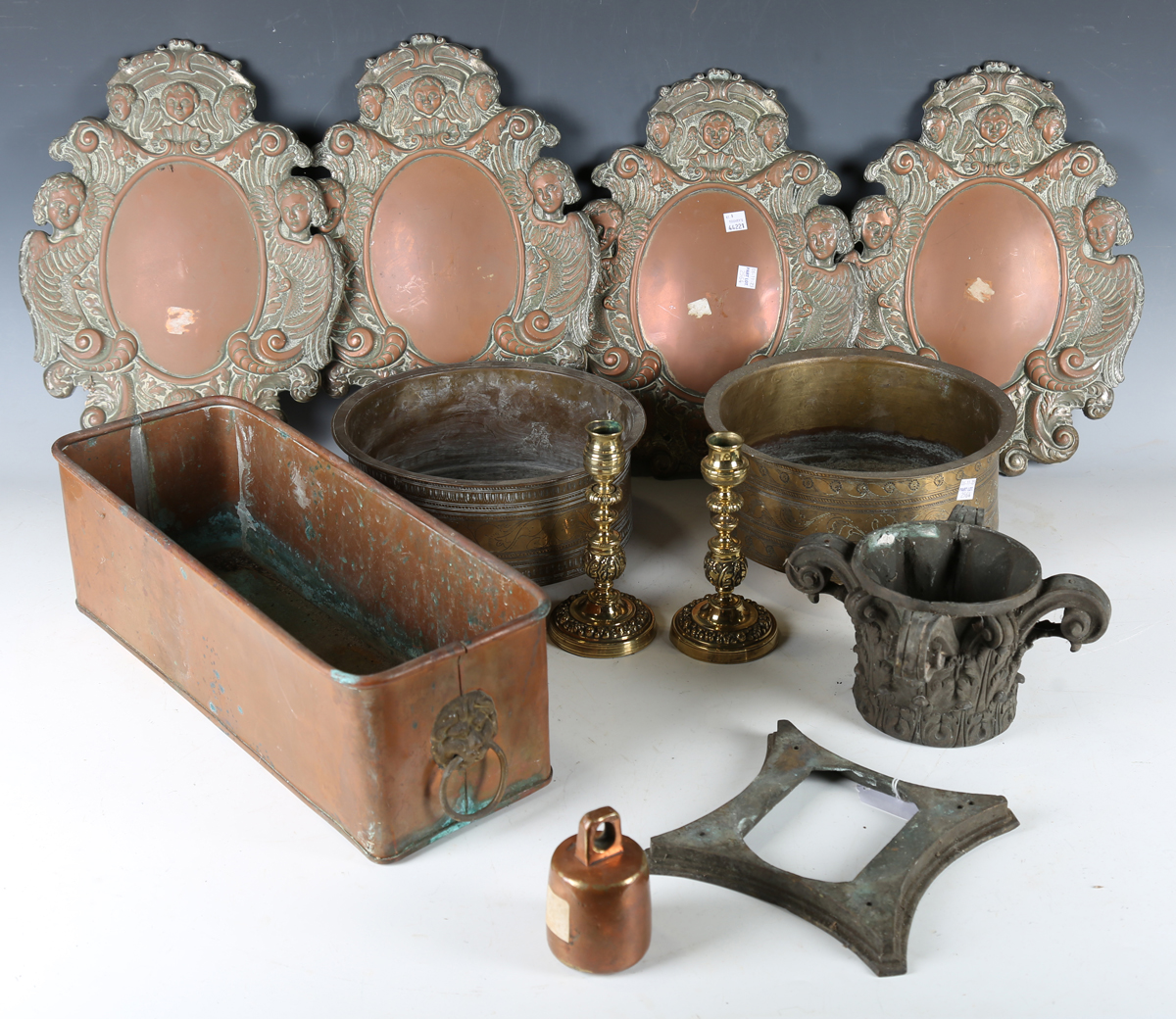 A 19th century cast bronze Corinthian capital mount, height 13.5cm, width 18cm, together with a collection of other metalwork items, including three preserve pans and a pair of 19th brass candlesticks.
