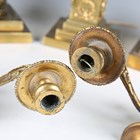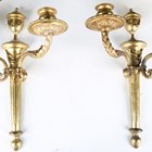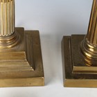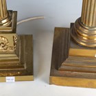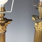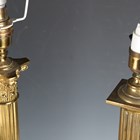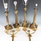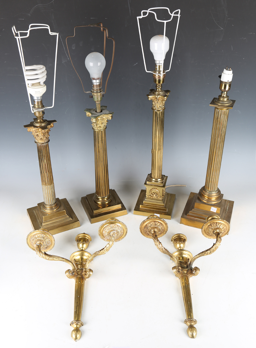 An early 20th century brass Corinthian column table lamp, height 40cm, together with three similar table lamps and a pair of gilt metal two light wall sconces, height 37cm.