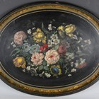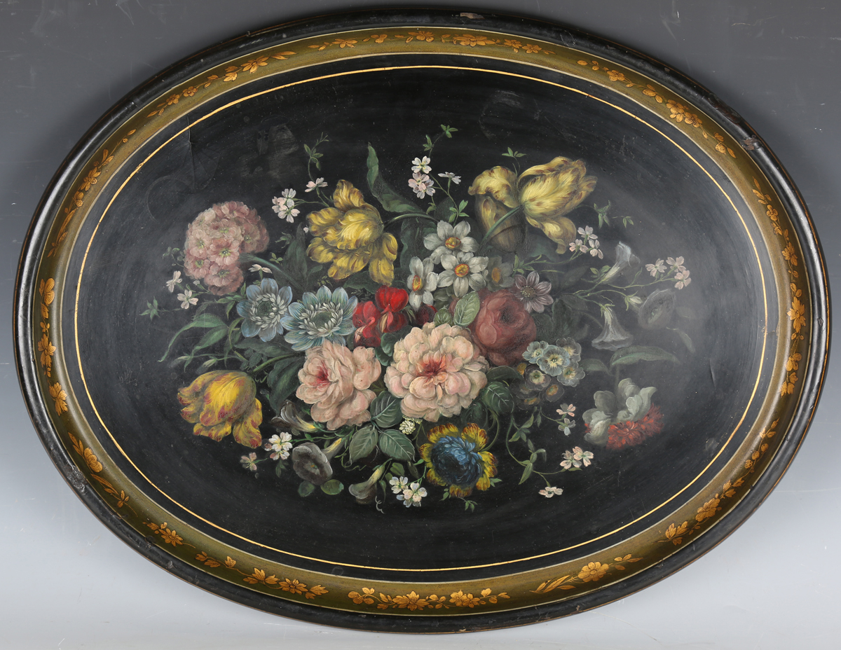 A Victorian papier-mâché oval tray, finely painted with a spray of flowers, bearing indistinct maker's mark to reverse, width 63cm.