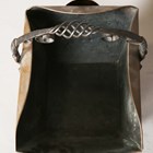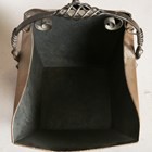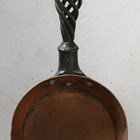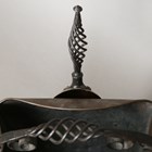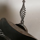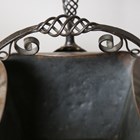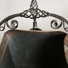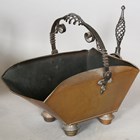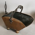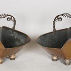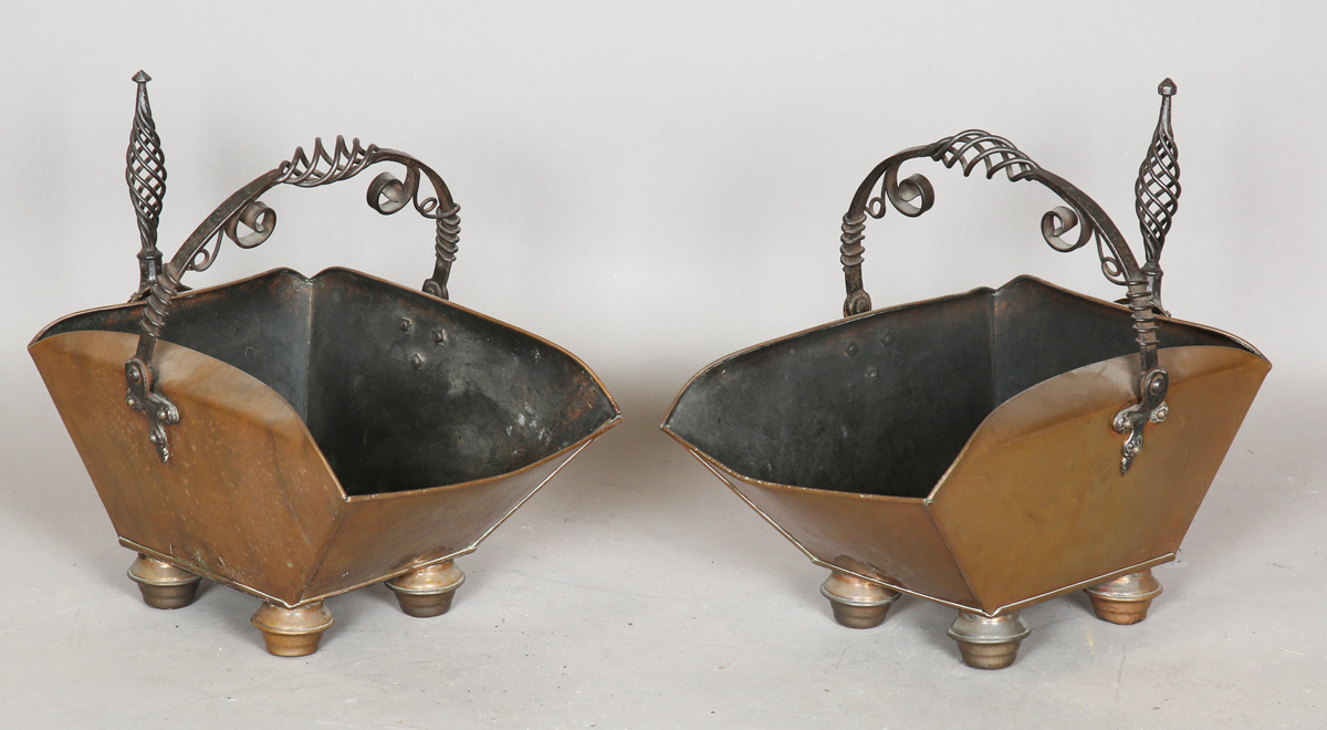 A pair of late Victorian Arts and Crafts copper and wrought iron coal scuttles, fitted with matching shovels, each bearing registration number to underside, height 40cm, length 40cm.