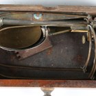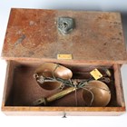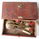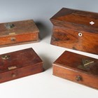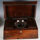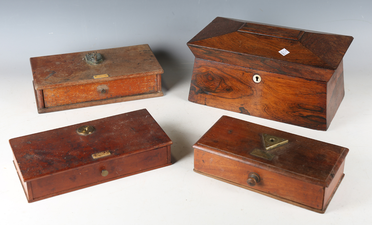 An early Victorian rosewood tea caddy, width 33cm, together with three cased sets of balance scales.