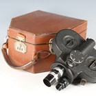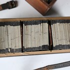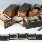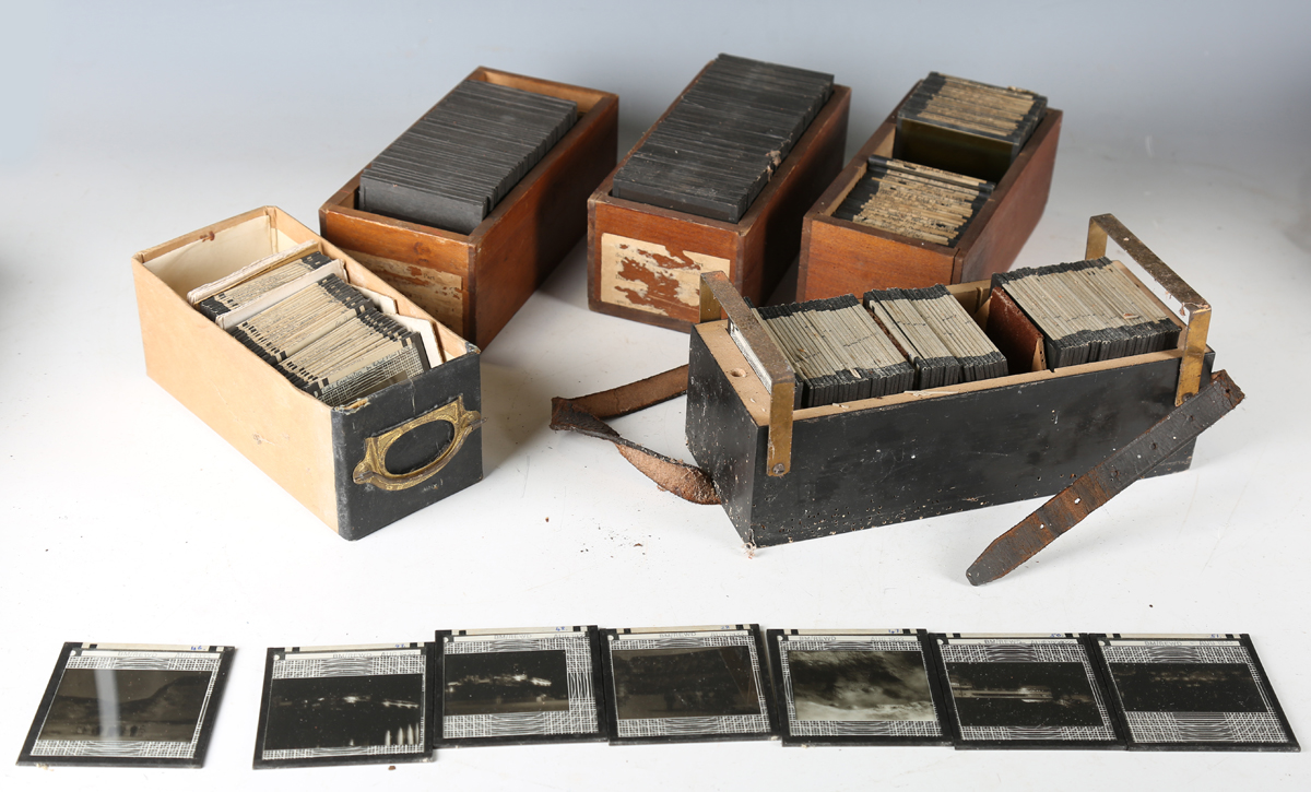 A collection of early/mid-20th century photographic glass lantern slides, including views of a cruise onboard ship and views of Mallorca and France, all contained within wooden boxes, together with a Bell & Howell model 70 cine camera, within its leather case.
