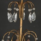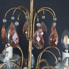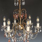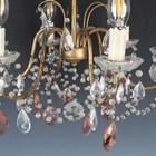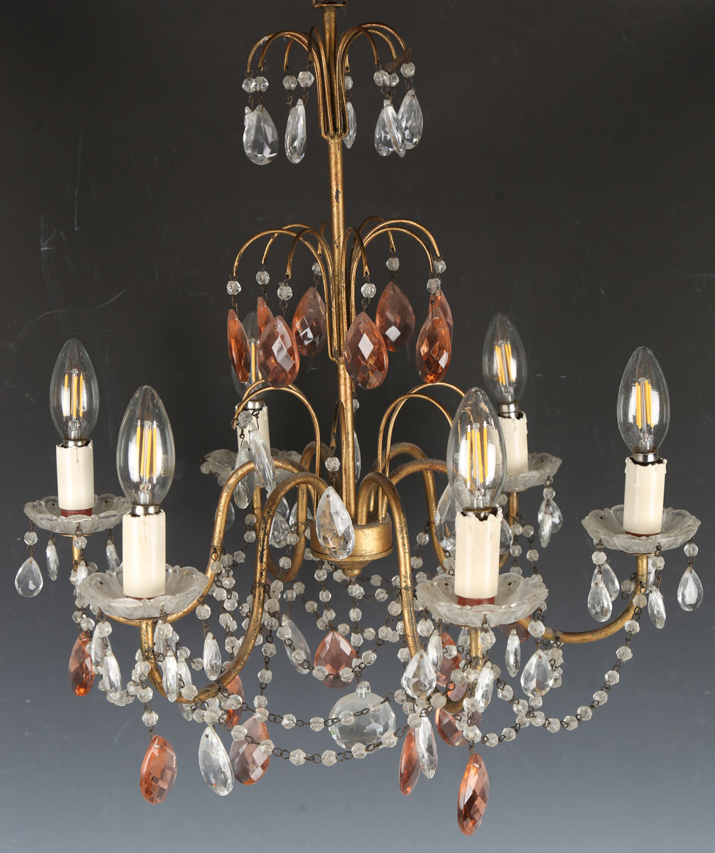 An early/mid-20th century gilt painted metal six-light chandelier, hung with clear and pink glass drops, height 55cm, width 46cm.