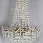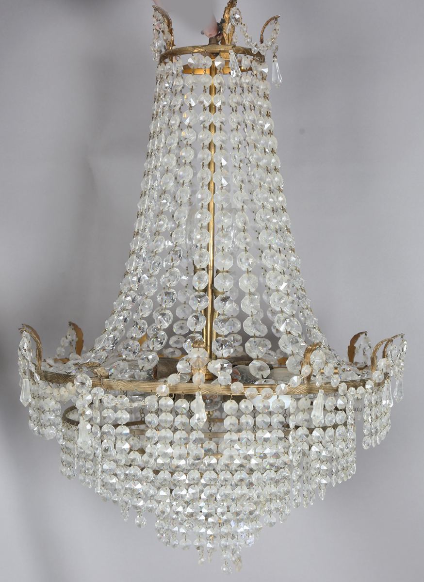 A late 20th century clear glass chandelier, hung with bead swags above five graduating tiers of further drops, height 70cm, diameter 50cm.