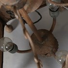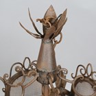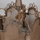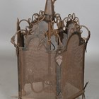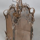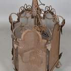 A 20th century French wrought iron and mesh pentagonal ceiling lantern with scroll and leaf mounts, height 80cm, width 50cm.