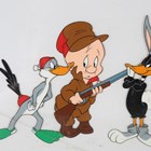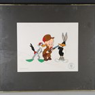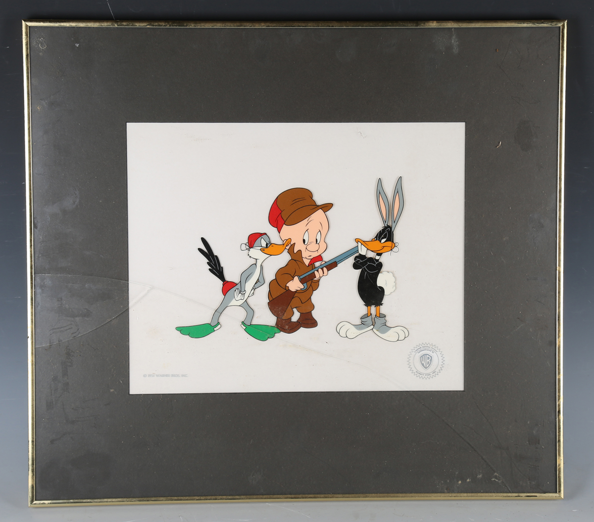 A Warner Bros Inc Looney Tunes cartoon cell depicting Elmer Fudd, Buggs Bunny and Daffy Duck, 28.5cm x 35cm, framed.