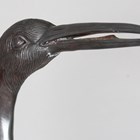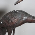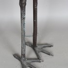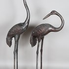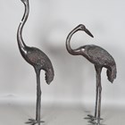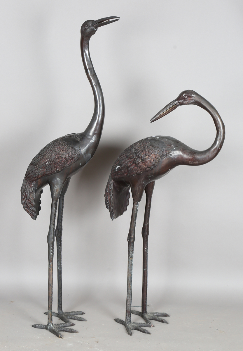 A pair of late 20th century brown patinated cast metal garden models of standing storks, heights 153cm and 121cm.