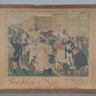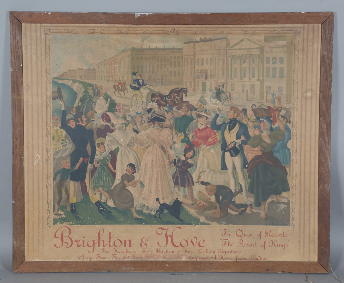 A Southern Electric 'Brighton & Hove' advertising board, after A.K. Zinkeisen, depicting a crowd of people on Brighton seafront, within an oak frame, 111cm x 135cm (faults).