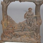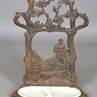 An early 20th century cast iron stick stand, the back in the form of a man with rifle and dog, height 70cm, width 44cm.