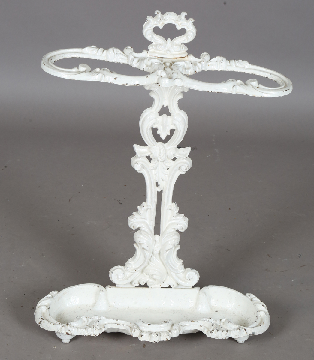 A late 19th century white painted cast iron stick stand of foliate form, height 65cm, width 46cm.