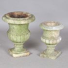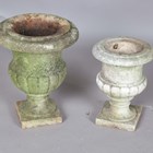 Two small carved marble garden urns of campana form, heights 38cm and 31cm.
