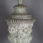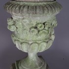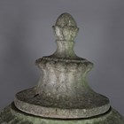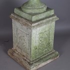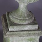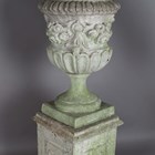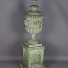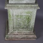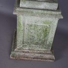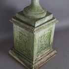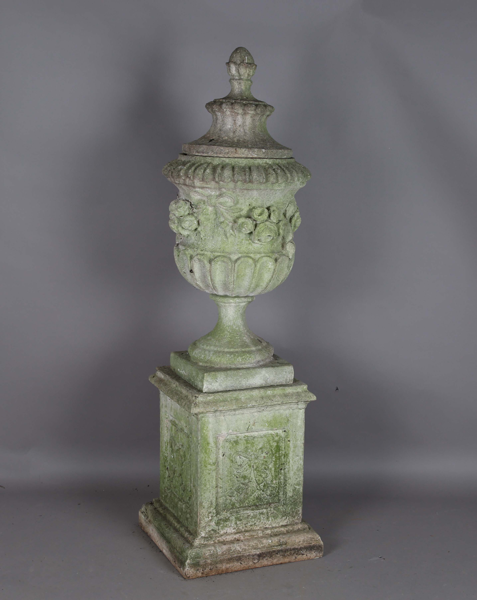 A late 20th century stone-effect cast resin garden urn with removable lid and foliate cast body, raised on a square plinth, height 172cm, width 51cm.