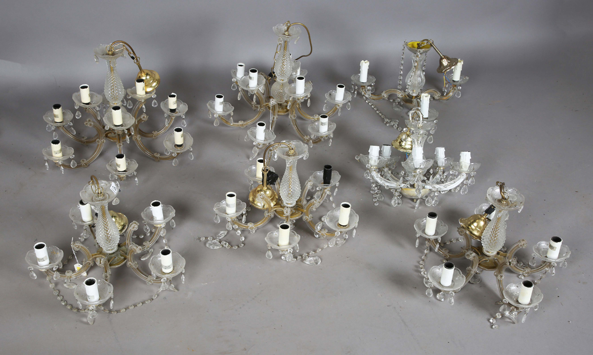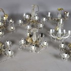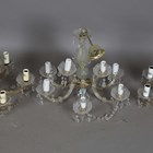 A group of ten mid-20th century clear glass and plastic mounted chandeliers, hung with bead swags, width of largest 54cm.