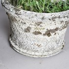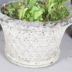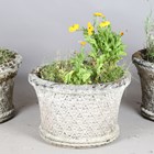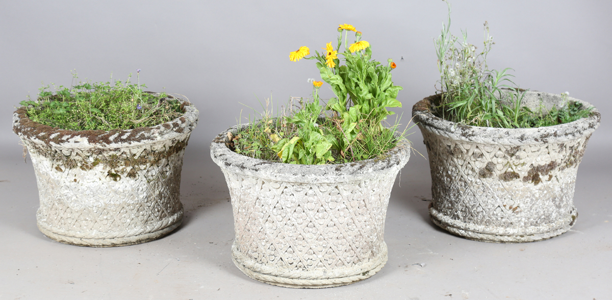 A set of three 20th century Haddonstone 'Italian' design garden urns, the exteriors with overall rosette lattice, height 42cm, diameter 63cm.