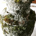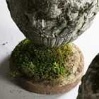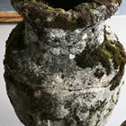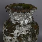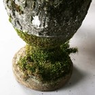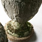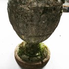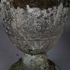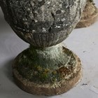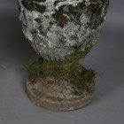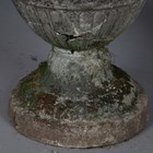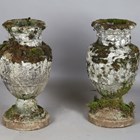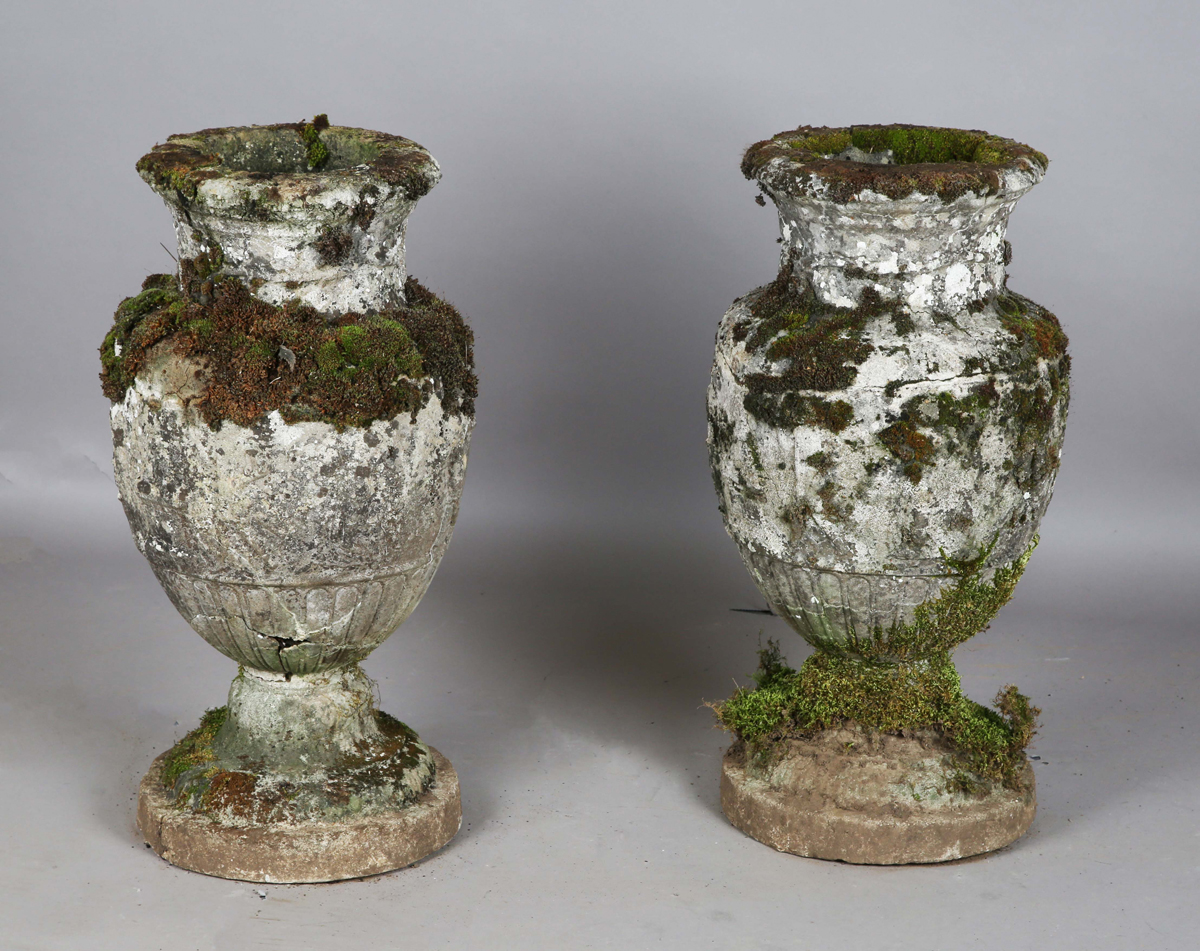 A pair of 20th century cast stone garden urns of classical ovoid form, the bodies decorated in relief with a continuous band of figures, height 78cm (faults and repairs).