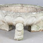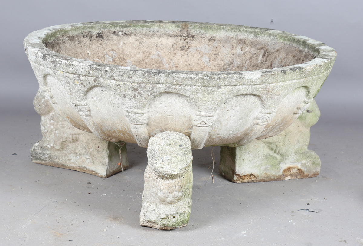 A large 20th century cast stone garden urn of shallow circular form, height 25cm, diameter 100cm.