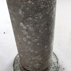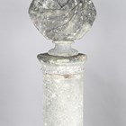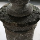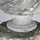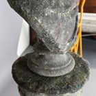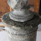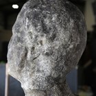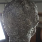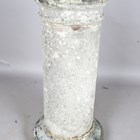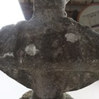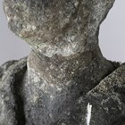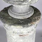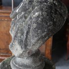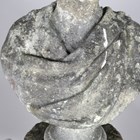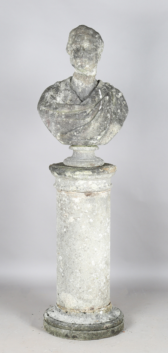 A late 18th/early 19th century weathered marble head and shoulders portrait bust of a gentleman wearing classical drapery, on a socle base, height 75cm, width 53cm, raised on a 20th century cast stone pedestal, height 95cm.