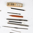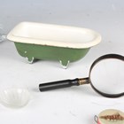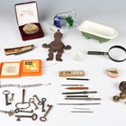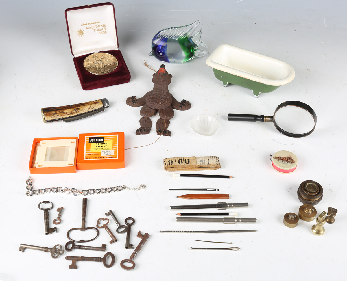 A Black Forest carved wood articulated bear, an antler mounted folding pocketknife, detailed 'Taylor Sheffield Real Witness Knife', eight brass weights, a magnifying glass, a miniature enamelled model bath, detailed 'W&M Ltd', a group of keys, an advertising tape measure and further items.