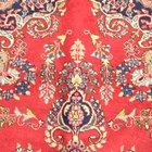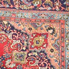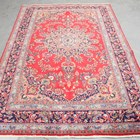 A Mashad carpet, Central Persia, late 20th century, the cherry red field with a circular medallion, within a blue flowering vine border, 275cm x 185cm.