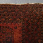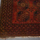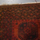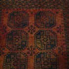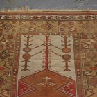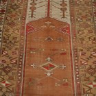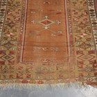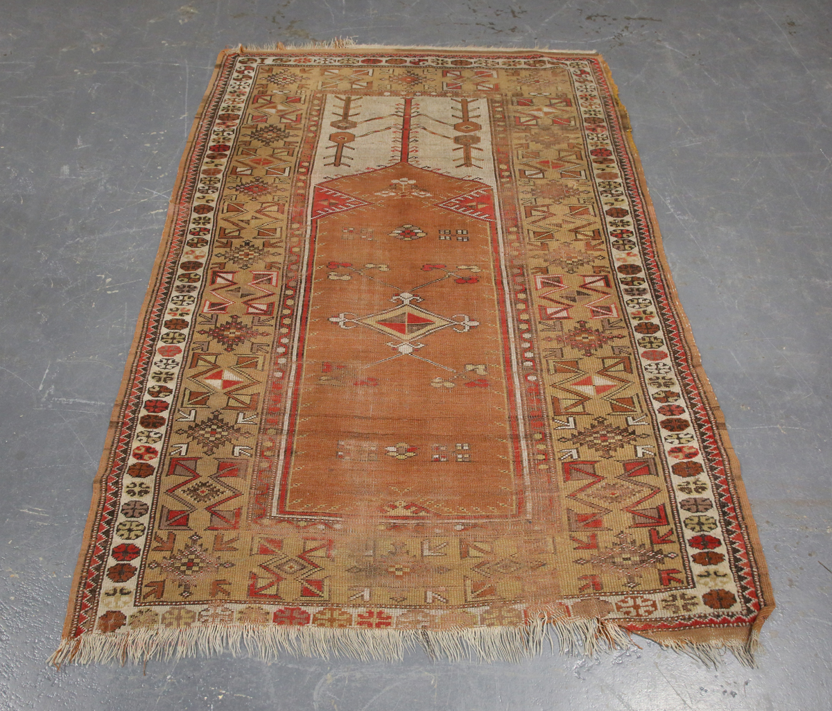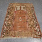 A Turkish prayer rug, mid-20th century, the dusty peach mihrab within a wide geometric border, 196cm x 133cm, together with a golden Afghan rug, 241cm x 157cm.