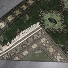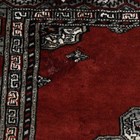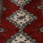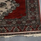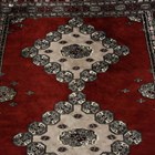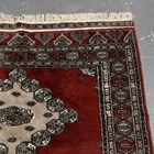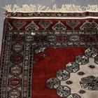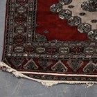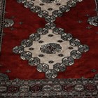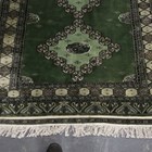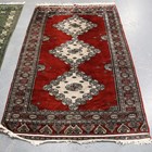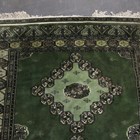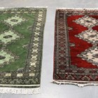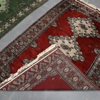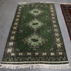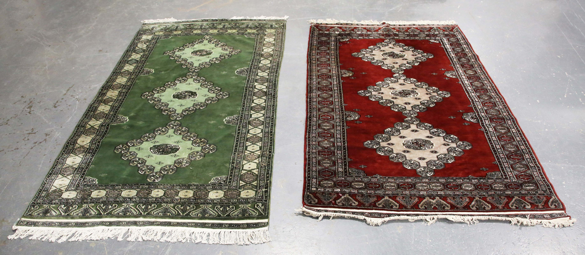 A Pakistan bokhara style rug, late 20th century, the claret field with three linked medallions, within a gul border, 204cm x 131cm, together with a matching green rug, 221cm x 128cm.
