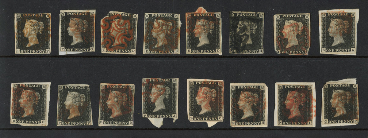 Great Britain 1840 1d black, used, sixteen examples most cut into or slight faults.