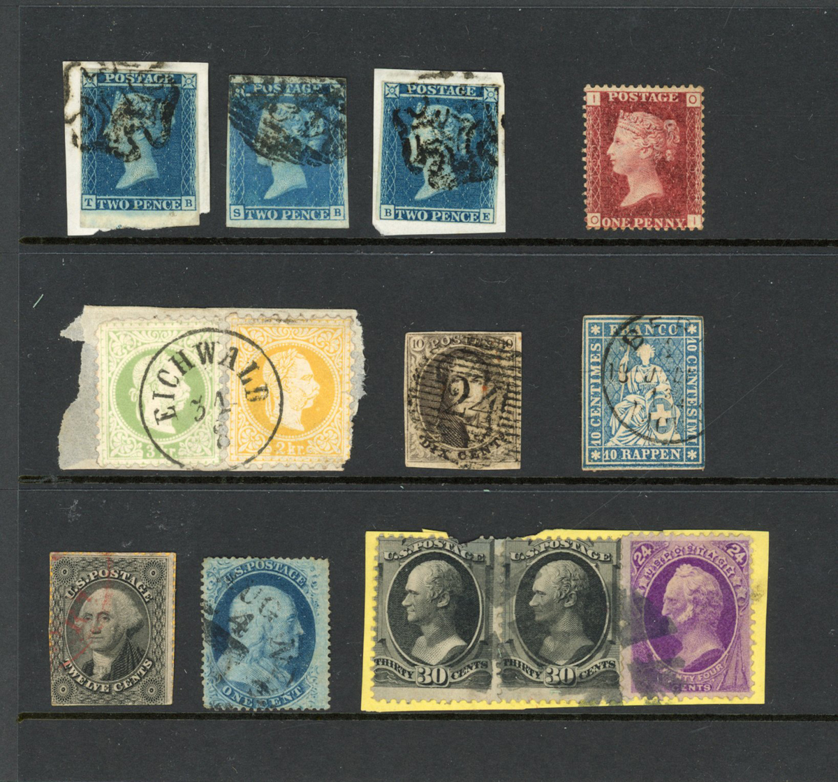 Early stamps on cards and in envelopes with Great Britain 1841 1d and 2d with Maltese Cross postmarks, 1d red plate 199 mint, Europe, Hong Kong, India, Kashmir and USA.
