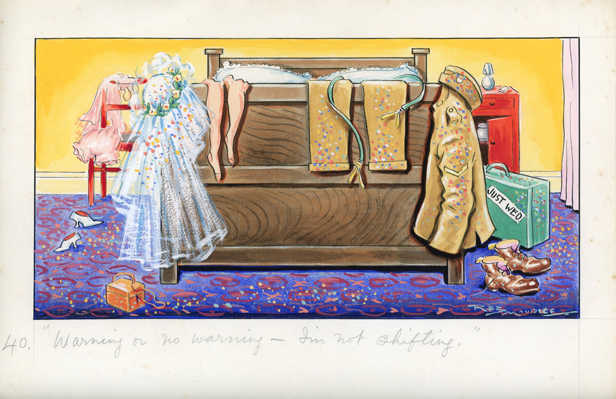 An original watercolour and ink by Reg Maurice for the postcard ‘Warning or no warning, I’m not shifting!’, signed, 23.5cm x 33.5cm.