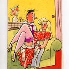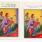 An original watercolour with gouache by ‘Trow’ for two postcards ‘Oh! George, you big soft thing!’ and ‘Did you say you were scuttled during the war?’, overall 22.5cm x 15cm, together with the finished postcards.