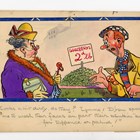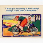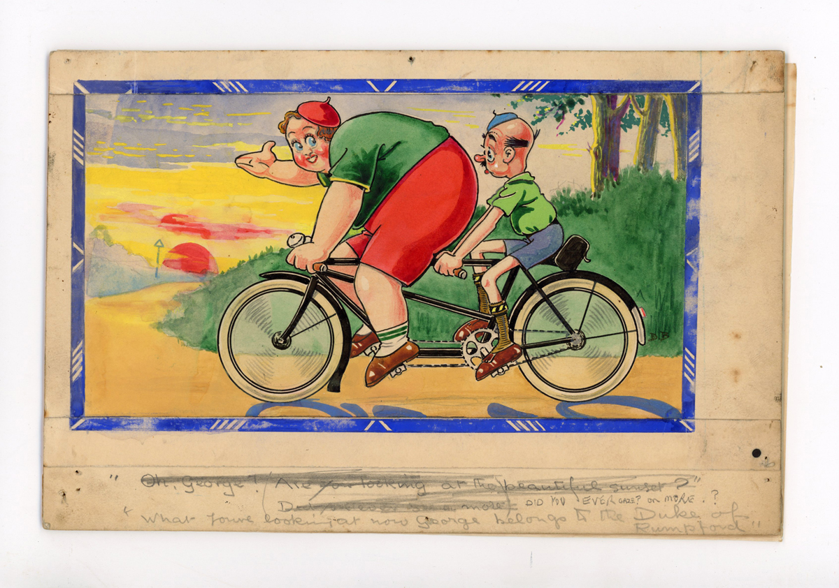 An original watercolour and ink by Dudley Graham Buxton for the postcard ‘What you’re looking at now George belongs to the Duke of Rumpford!’, 16.5cm x 25cm, together with another postcard design by the same hand ‘Looks a Bit Dirty Do They?...’, 17.5cm x 25cm, and the finished postcards for both published by Inter-Art.