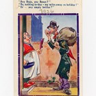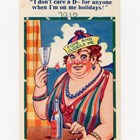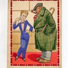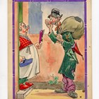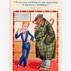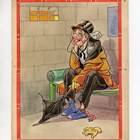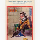 An original watercolour and ink by Dudley Graham Buxton for the postcard ‘This Place is Packed, but I’ve got a room to myself!’, 23.5cm x 17cm, together with three further postcard designs by the same hand, and the finished postcards for each, published by Inter-Art.