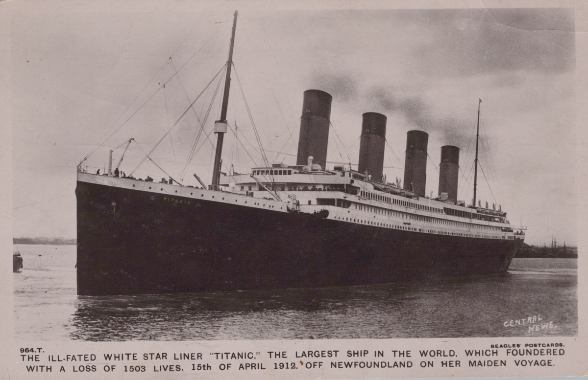 A group of 19 postcards all relating to shipwrecks and disasters, including photographic postcards titled ‘On the Rocks, Wreck of the Socoa at Cadgwith’, ‘Wreck on the Chesil Beach’, ‘The Ill-fated White Star Liner Titanic…’, ‘Wreck of the County of Anglesea’, ‘S.S. Suevic in Southampton Docks’, ‘German Submarine at Falmouth’, ‘S.S. Eastfield, Stranded at Beachy Head’ and ‘German Barque Pindos wrecked at Coverack’.