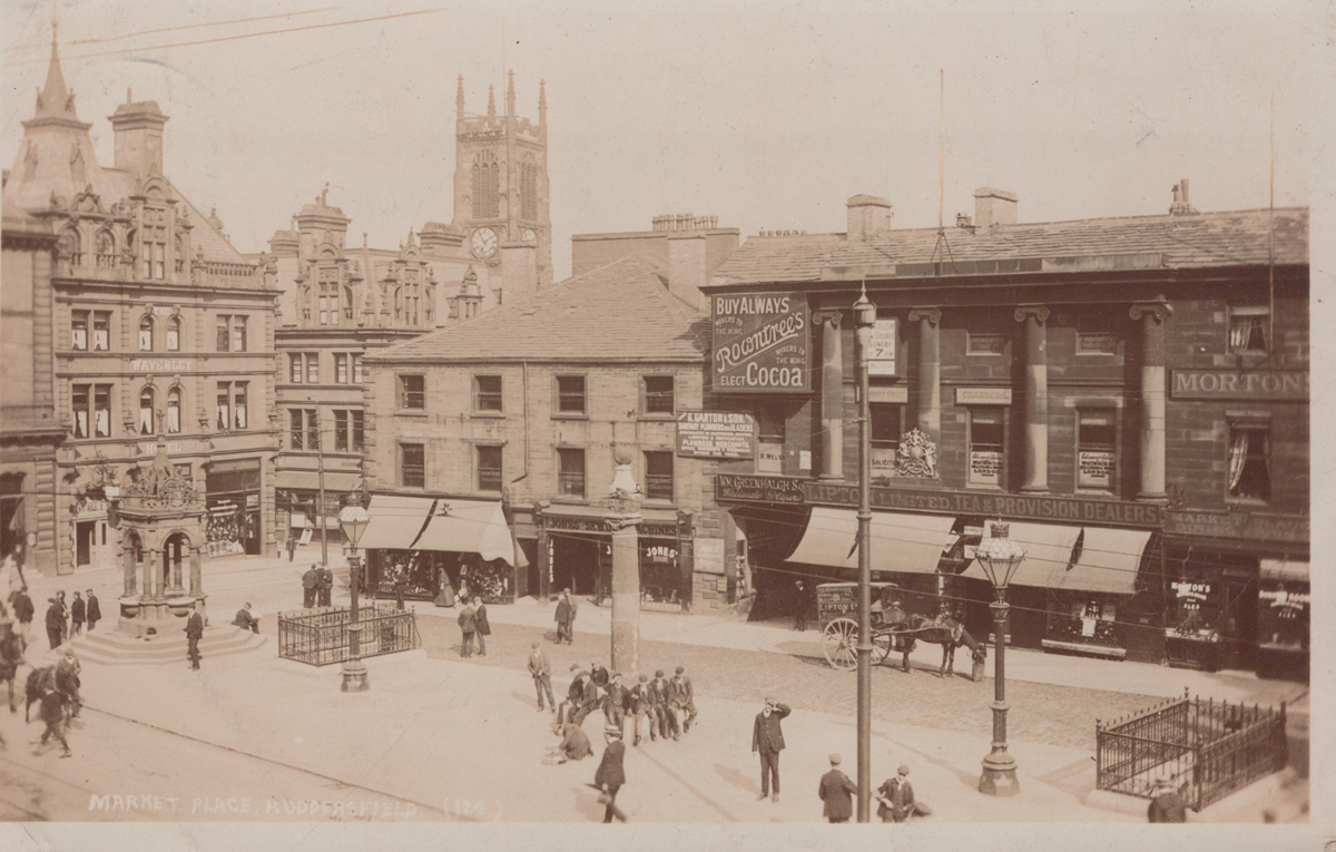 A collection of approximately 54 postcards of Yorkshire, including photographic postcards titled ‘Market Place, Huddersfield’, ‘Proclamation of King George V at Halifax’, ‘Alexandra Dock, Hull’, ‘Damage Caused By Flood Through Cloudburst’, ‘Crown Street, Halifax’, ‘Market Place, Helmsley’, ‘High Ham’ and 'Stump Cross, Halifax’.