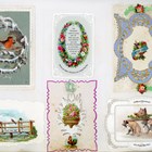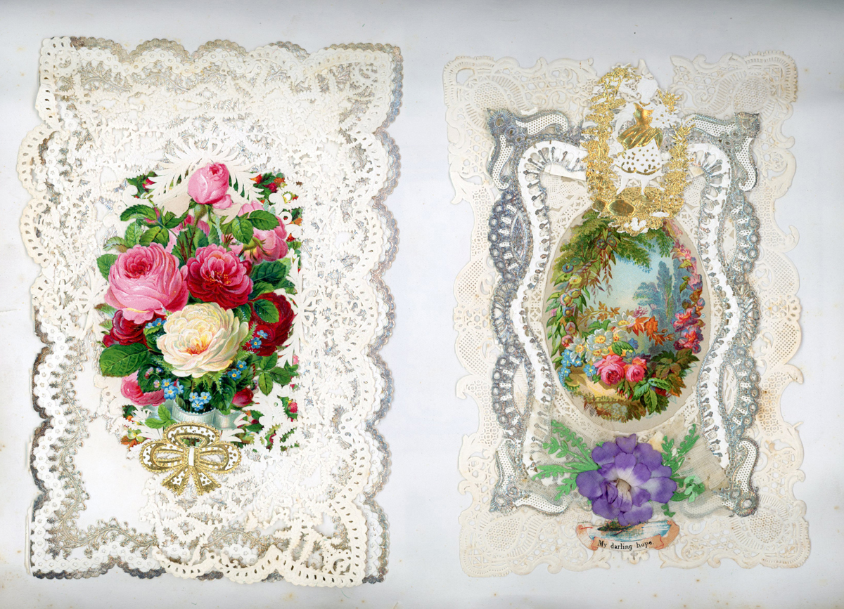 GREETINGS CARDS. An album containing approximately 218 mounted greetings cards, often interspersed with ‘scraps’, the majority late 19th and early 20th century, leaves 29cm x 22cm, including Christmas, Valentines and birthday greetings.