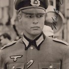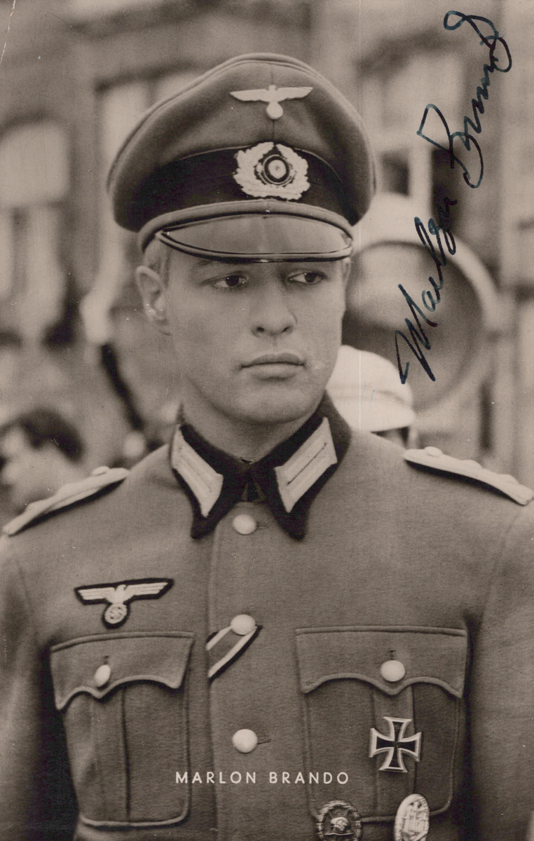 AUTOGRAPH. A deckle-edge postcard of Marlon Brando in the role of Christian Diestl in the movie ‘The Young Lions’, signed in ink, 14cm x 9cm.