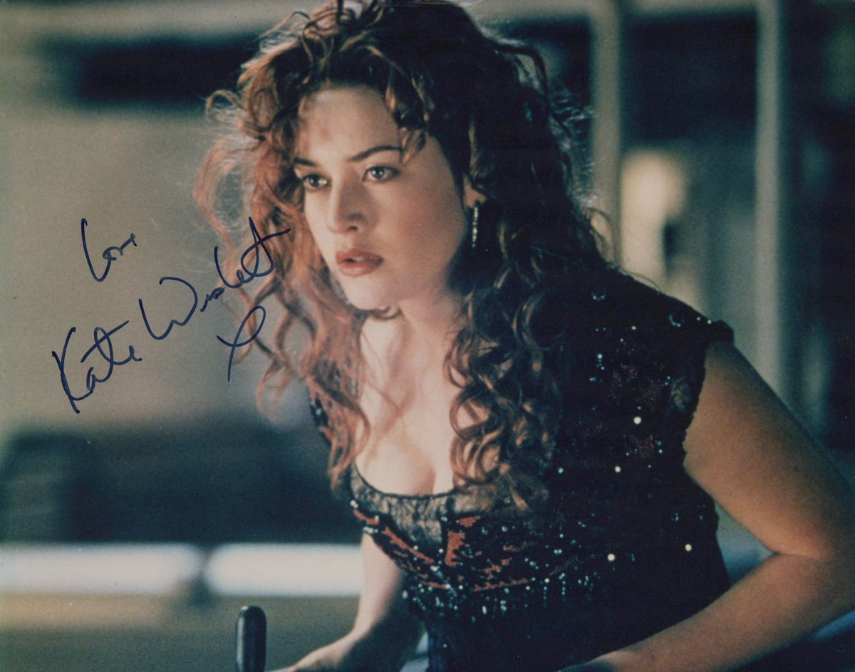AUTOGRAPHS. A colour photograph of Kate Winslet in the role of Rose DeWitt Bukater in the film ‘Titanic’ signed in ink, 20.5cm x 25.5cm, offered with Certificate of Authenticity from Fraser’s Autographs, together with a colour photograph signed by Leonardo DiCaprio, 25.5cm x 20.5cm offered with Auction Certificate from RR Auction.