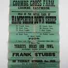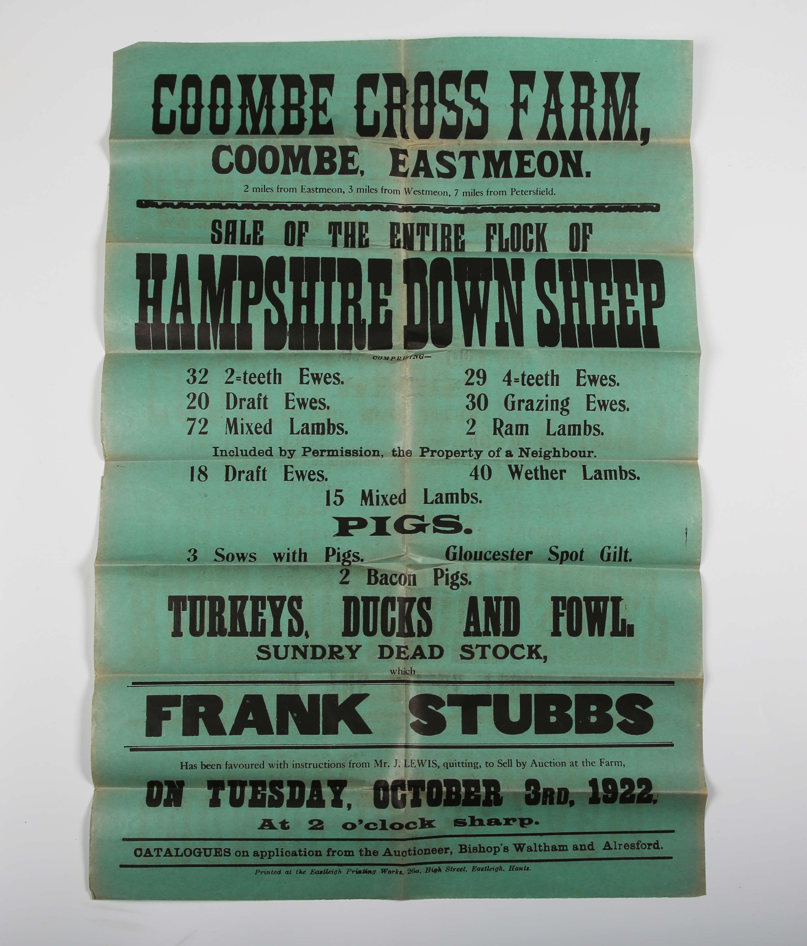 HAMPSHIRE. Two posters printed in black ink on green paper advertising ‘Sale of the Entire Flock of Hampshire Down Sheep’ from Coombe Cross Farm, Coombe, East Meon, on October 3rd, 1922, each 73cm x 51cm.