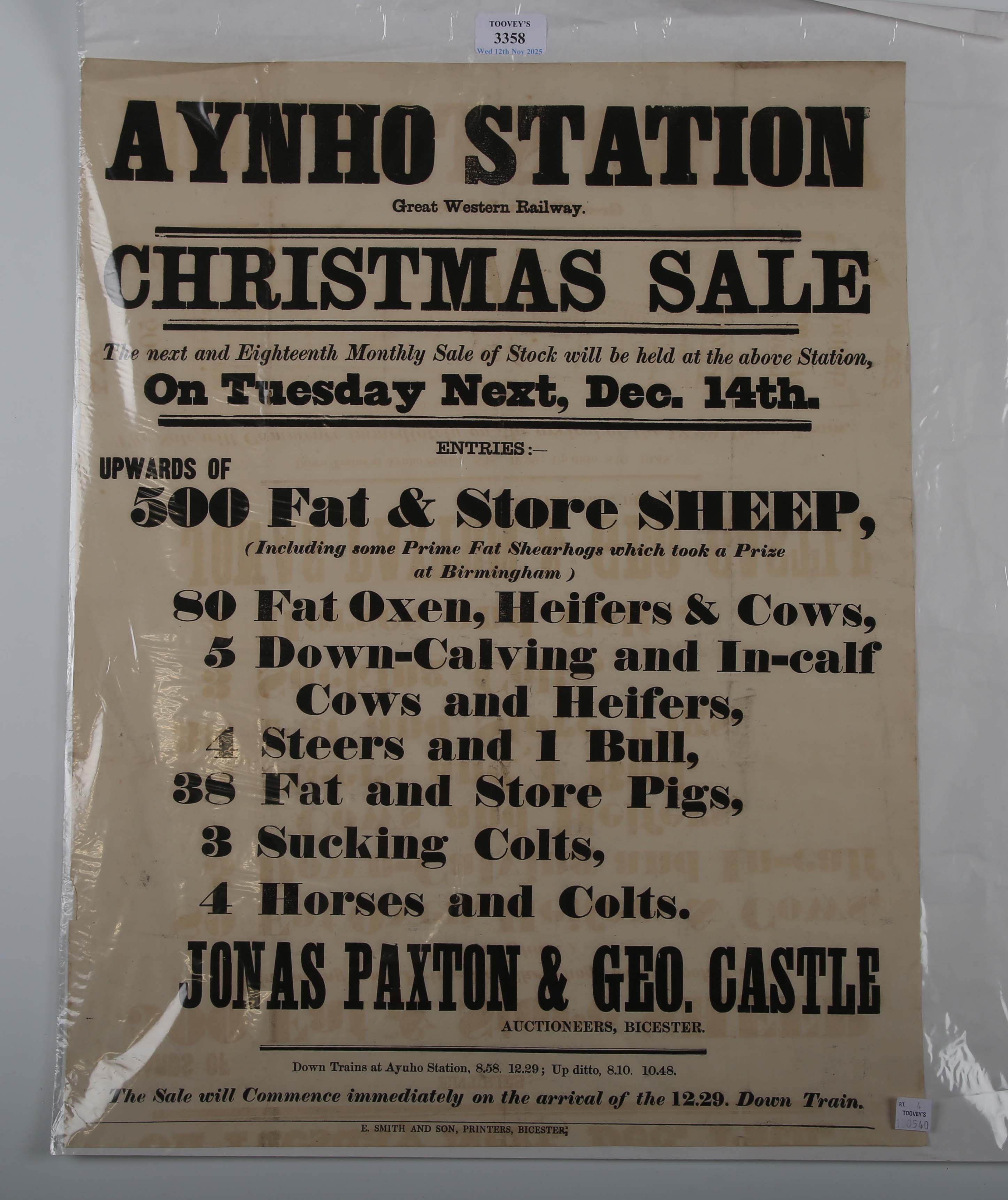 POSTER. An Aynho Station Great Western Railway poster, circa 1880s, 57.5cm x 44.5cm, advertising a ‘Christmas Sale’ of livestock held by Jonas Paxton & Geo. Castle Auctioneers, Bicester, together with another poster advertising a property auction in Leighton Buzzard by the same auctioneers.