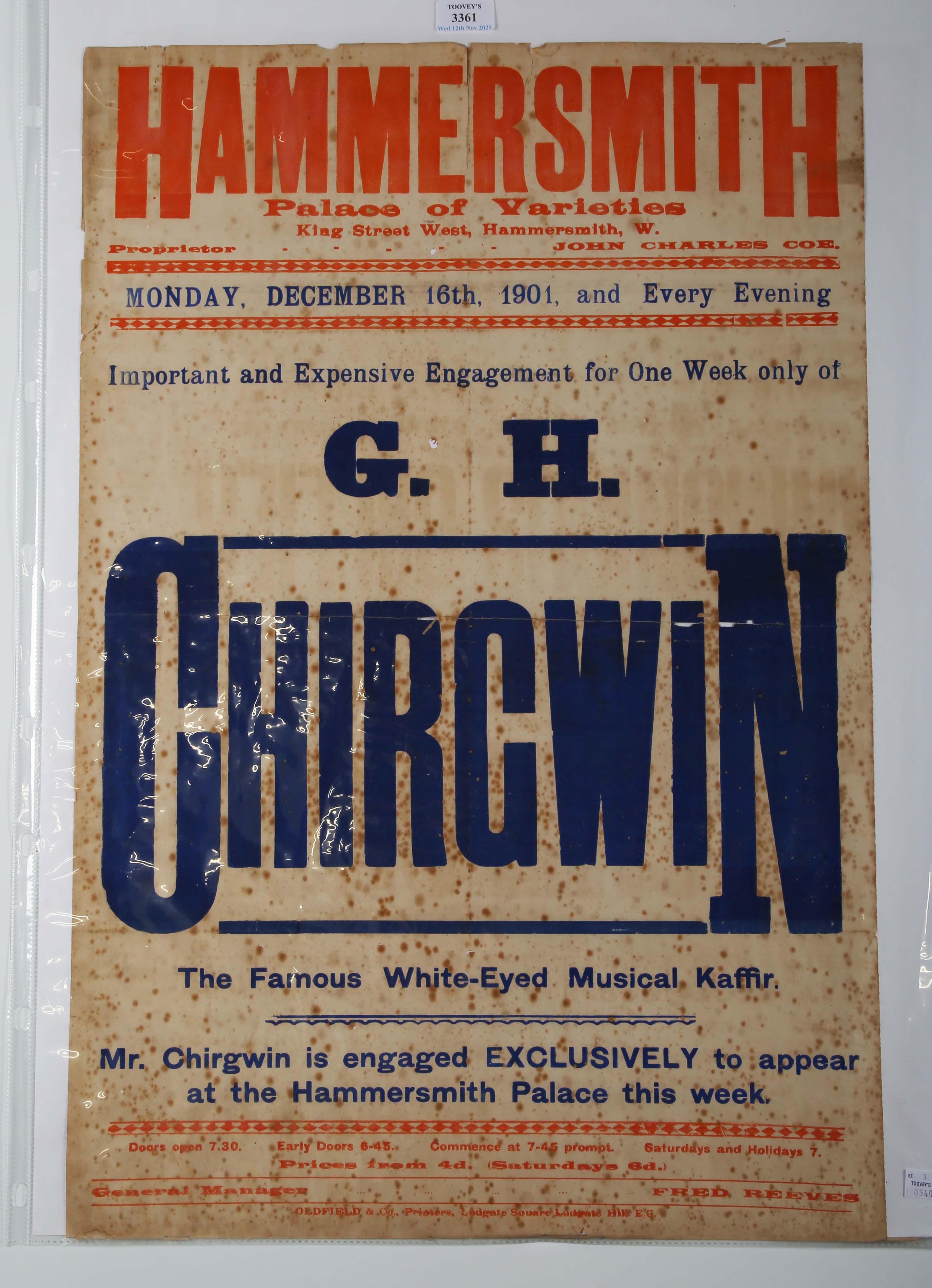 POSTERS. Two large Hammersmith Palace of Varieties theatre posters printed in red and blue, circa 1901, each 76cm x 50.5cm, both advertising G.H. Chirgwin.