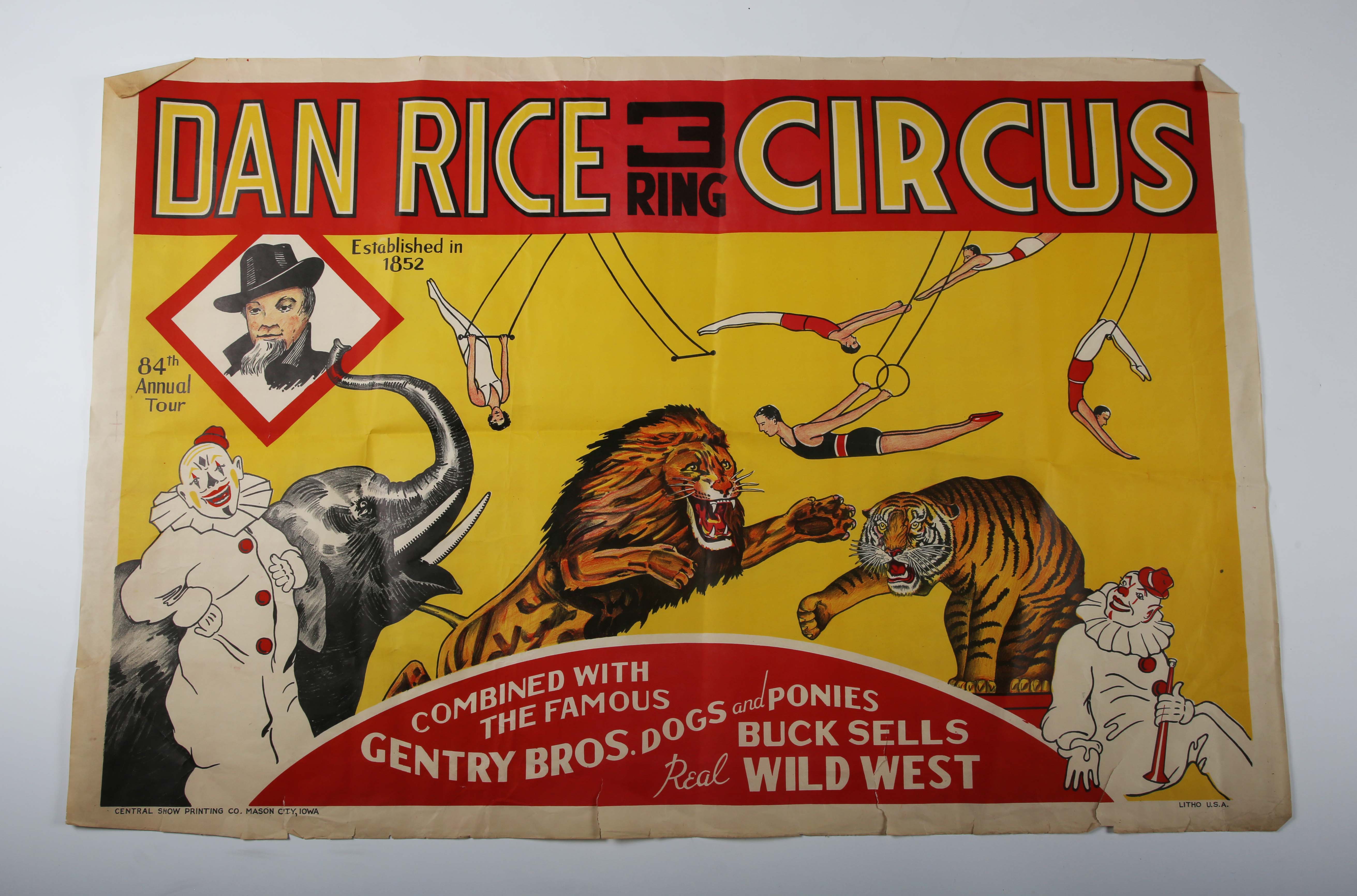 POSTER. A ‘Dan Rice 3 Ring Circus’ advertising poster for the 84th Annual Tour, printed in Iowa, America, circa 1930s, 71cm x 106.5cm.