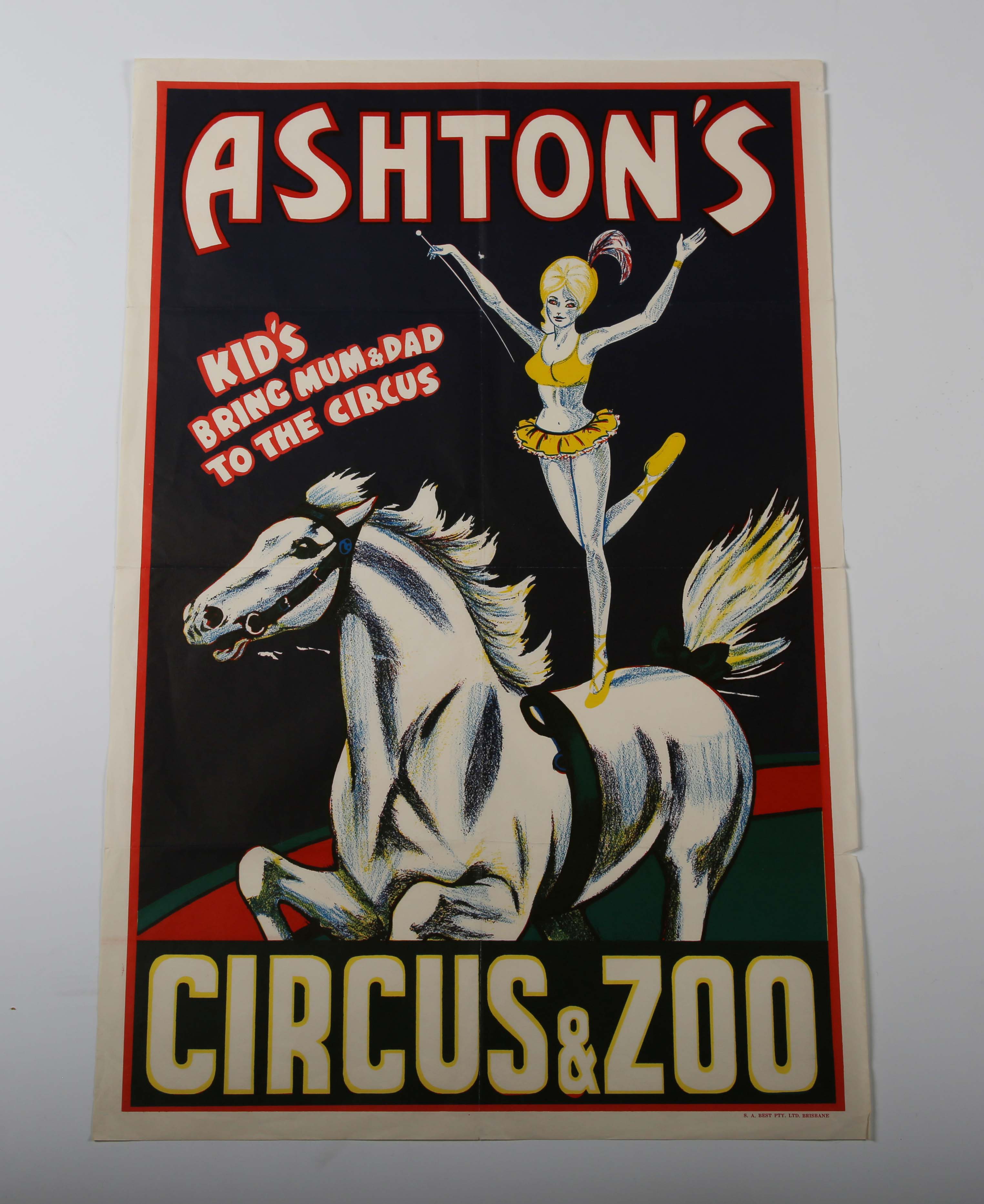 POSTERS. An ‘Ashton’s Circus & Zoo’ advertising poster, printed in Brisbane by S.A. Best, circa 1976, together with a ‘Circus Reco’ poster for the Helston Fair Ground.