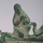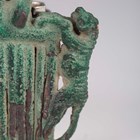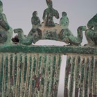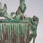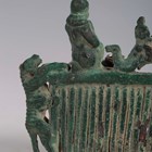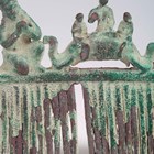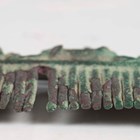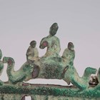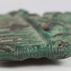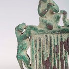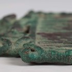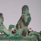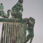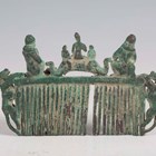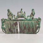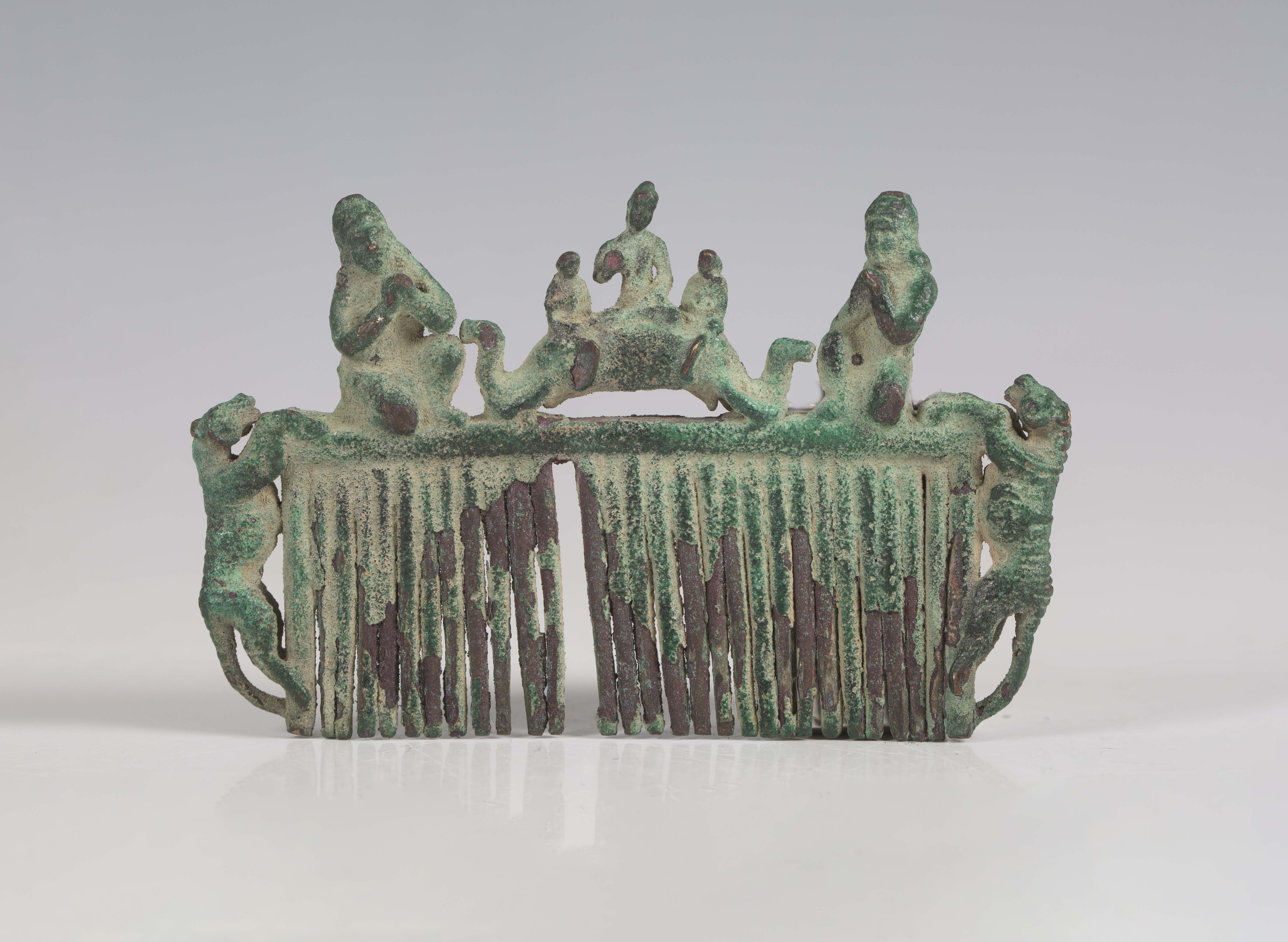 A Gandhara bronze comb, 2nd/3rd century, with verdigris patination, the figural surmount with Buddha and acolytes above tigers to the side, length 11.7cm. Provenance: the Alain Presencer Collection.