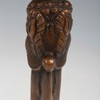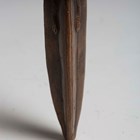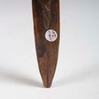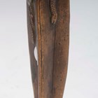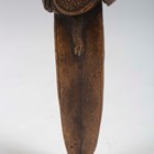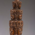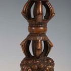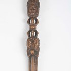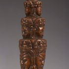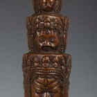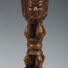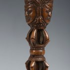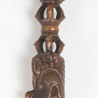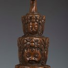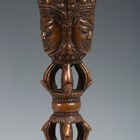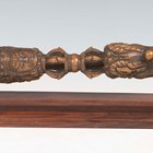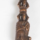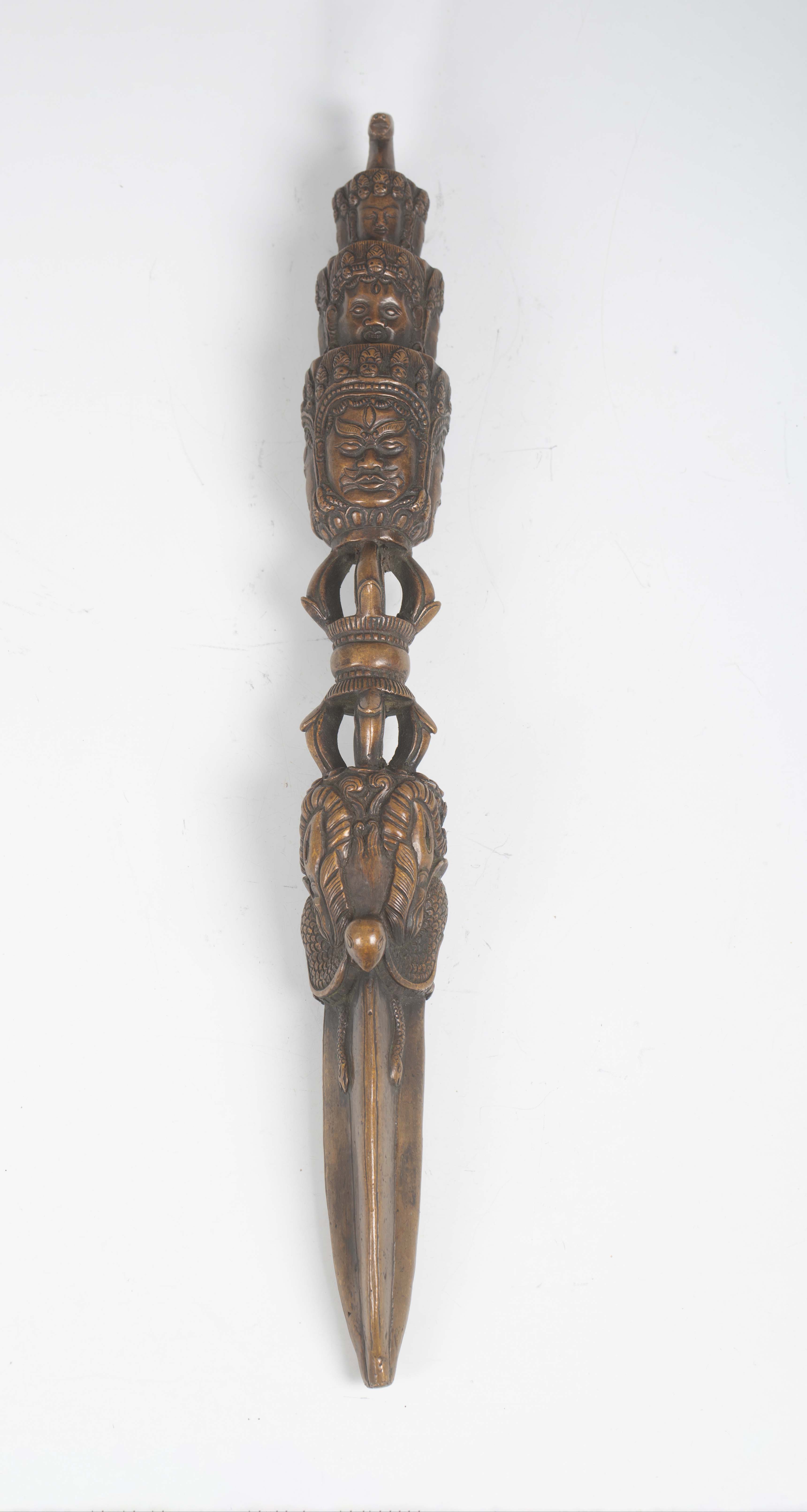 A Tibetan brown patinated bronze phurba (ritual dagger), 19th/20th century, the stepped handle cast with three tiers of three deity masks below a horse-head terminal, centred with a vajra knop and zoomorphic mask issuing a triple-sided blade, length 38.4cm, with hardwood stand. Provenance: the Alain Presencer Collection.