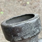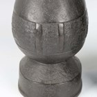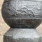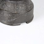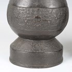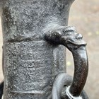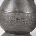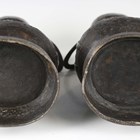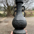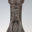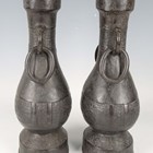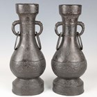 A pair of Chinese archaistic brown patinated bronze hu vases, Ming dynasty, each pear-form body cast with panels of taotie on a keyfret ground, the slender neck flanked by a pair of dragon mask and tongue loose ring handles, on oval bases, height 33.2cm (one with small missing section of footrim).