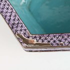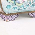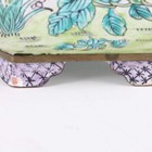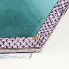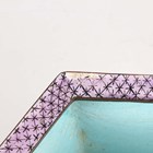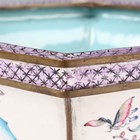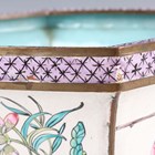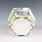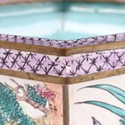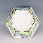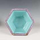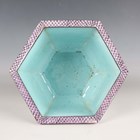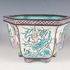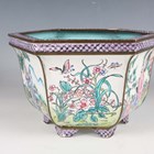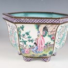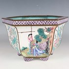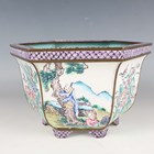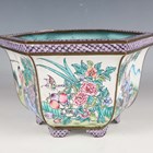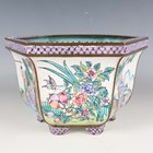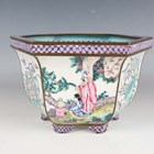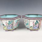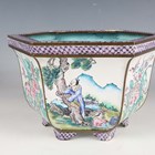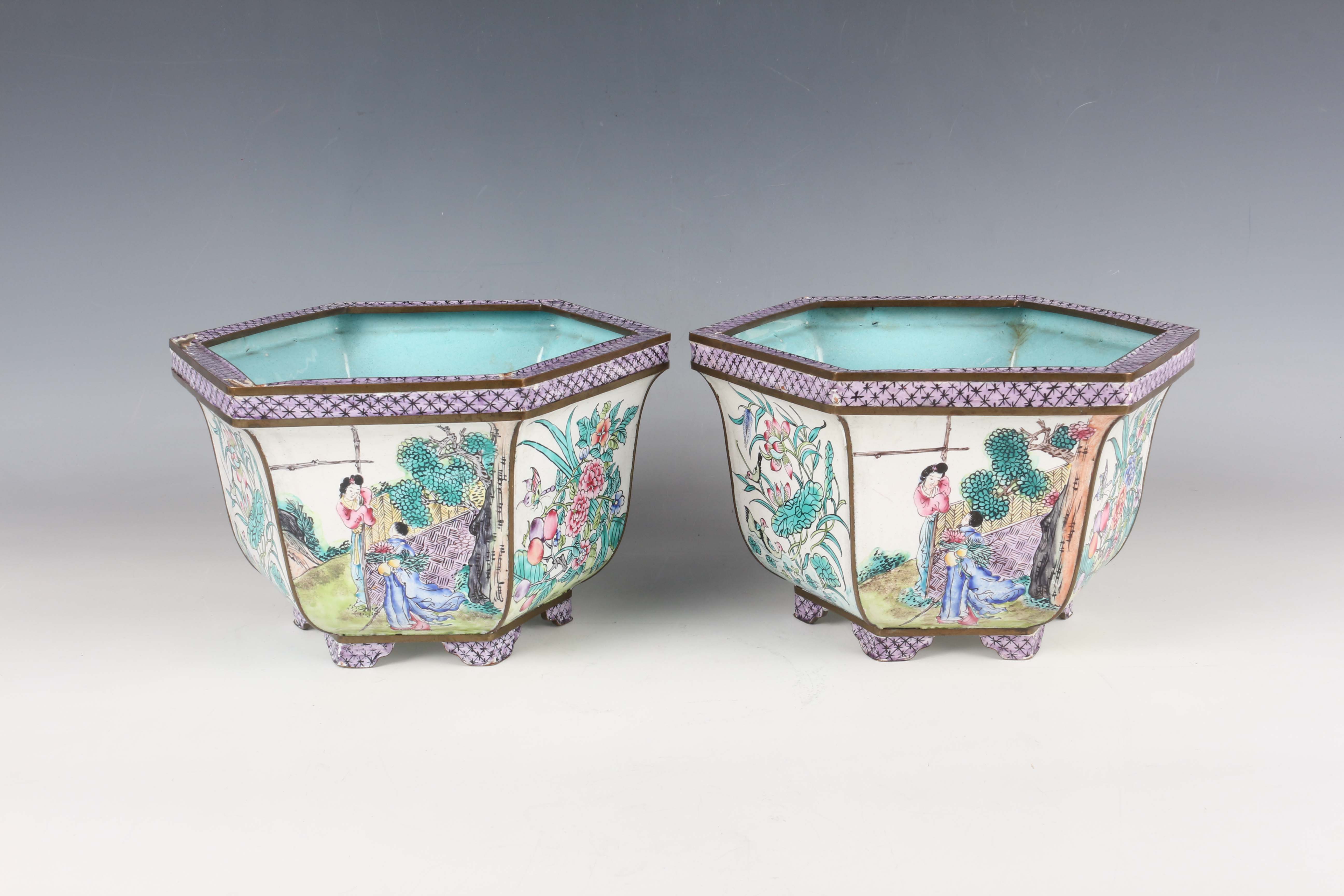 A pair of Chinese Canton enamel hexagonal planters, 20th century, each exterior facet painted with scenes of figures in landscapes, alternating with flowers and fruit studies, within pink and black trellis borders, height 12.8cm, width 21.6cm (some faults).