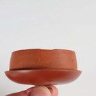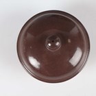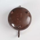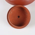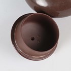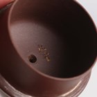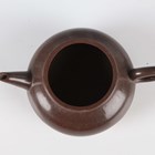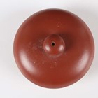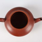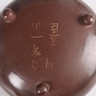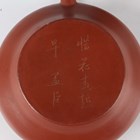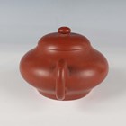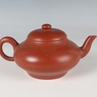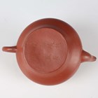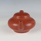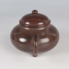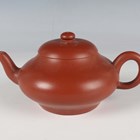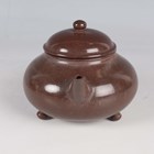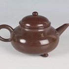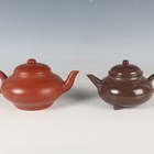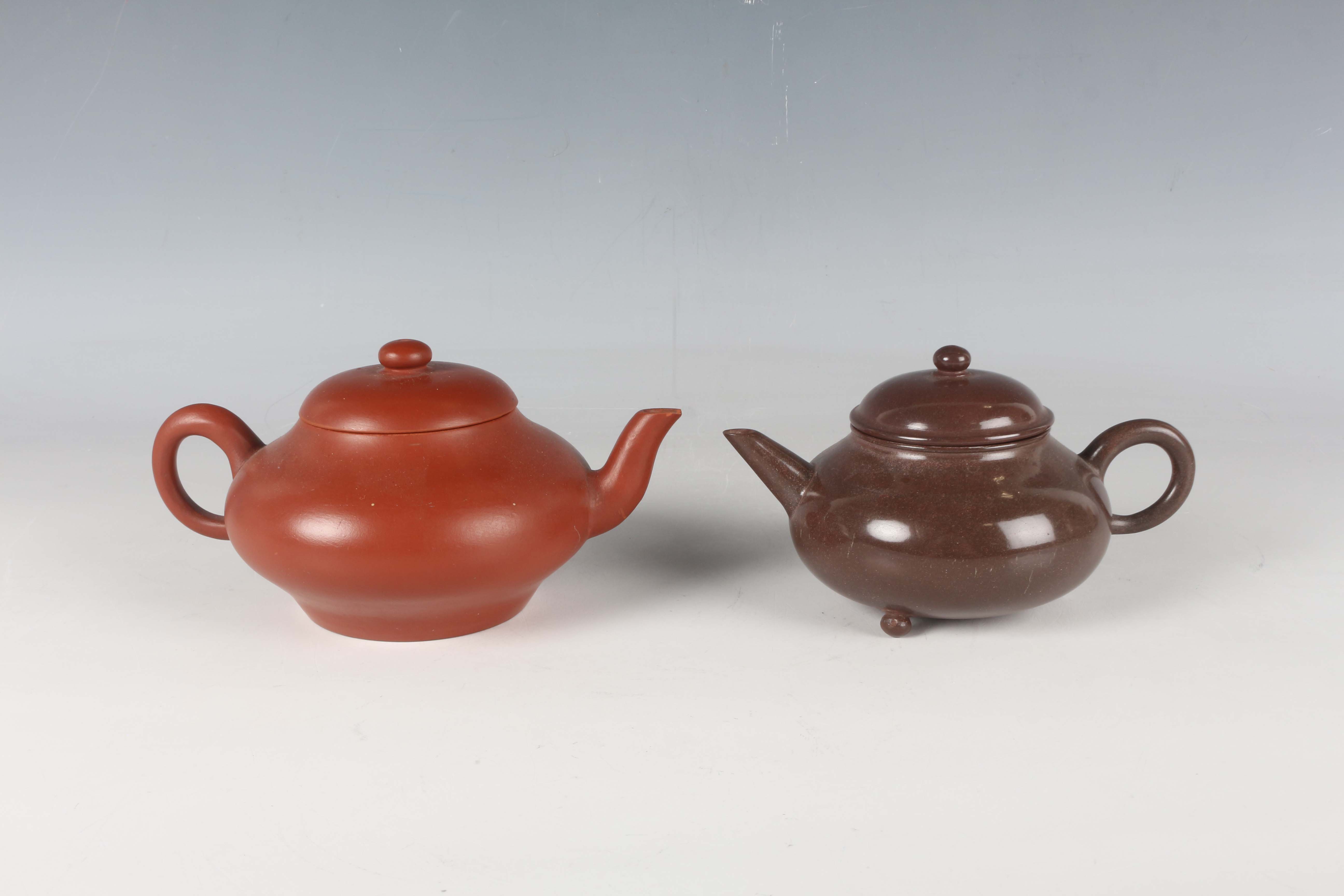 A Chinese Yixing stoneware teapot and cover of squat globular form with loop handle and short scroll spout, incised seven-character mark to base, height 7cm, length 15.7cm (chip to spout), together with a Chinese polished brown Yixing stoneware teapot and cover of squat globular form on three ball feet, incised mark to base, height 7cm, length 13.5cm.