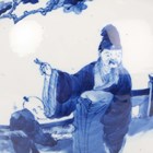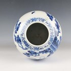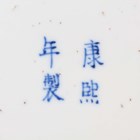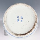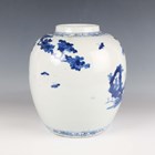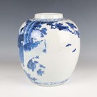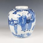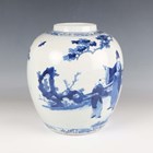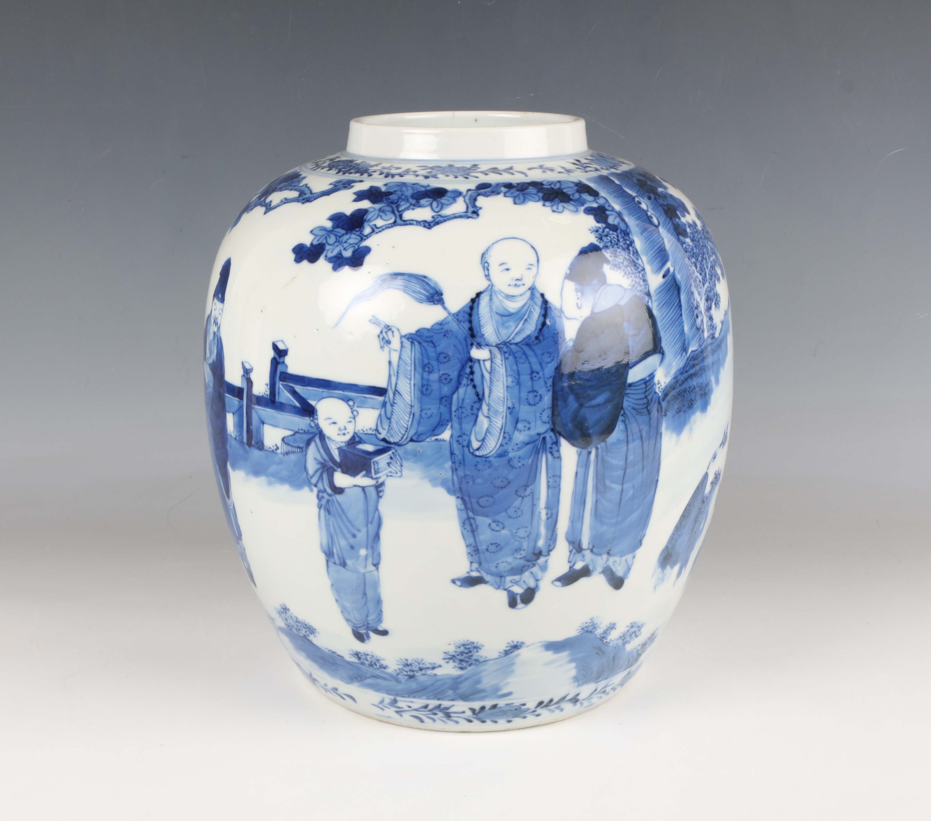 A Chinese blue and white porcelain ginger jar, mark of Kangxi but late 19th century, of ovoid form, painted with a scene of figures in a fenced garden setting, underglaze blue four-character mark to base, height 25.5cm (small hairline to rim).