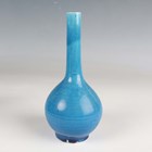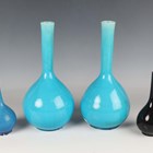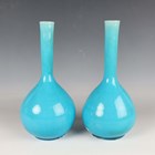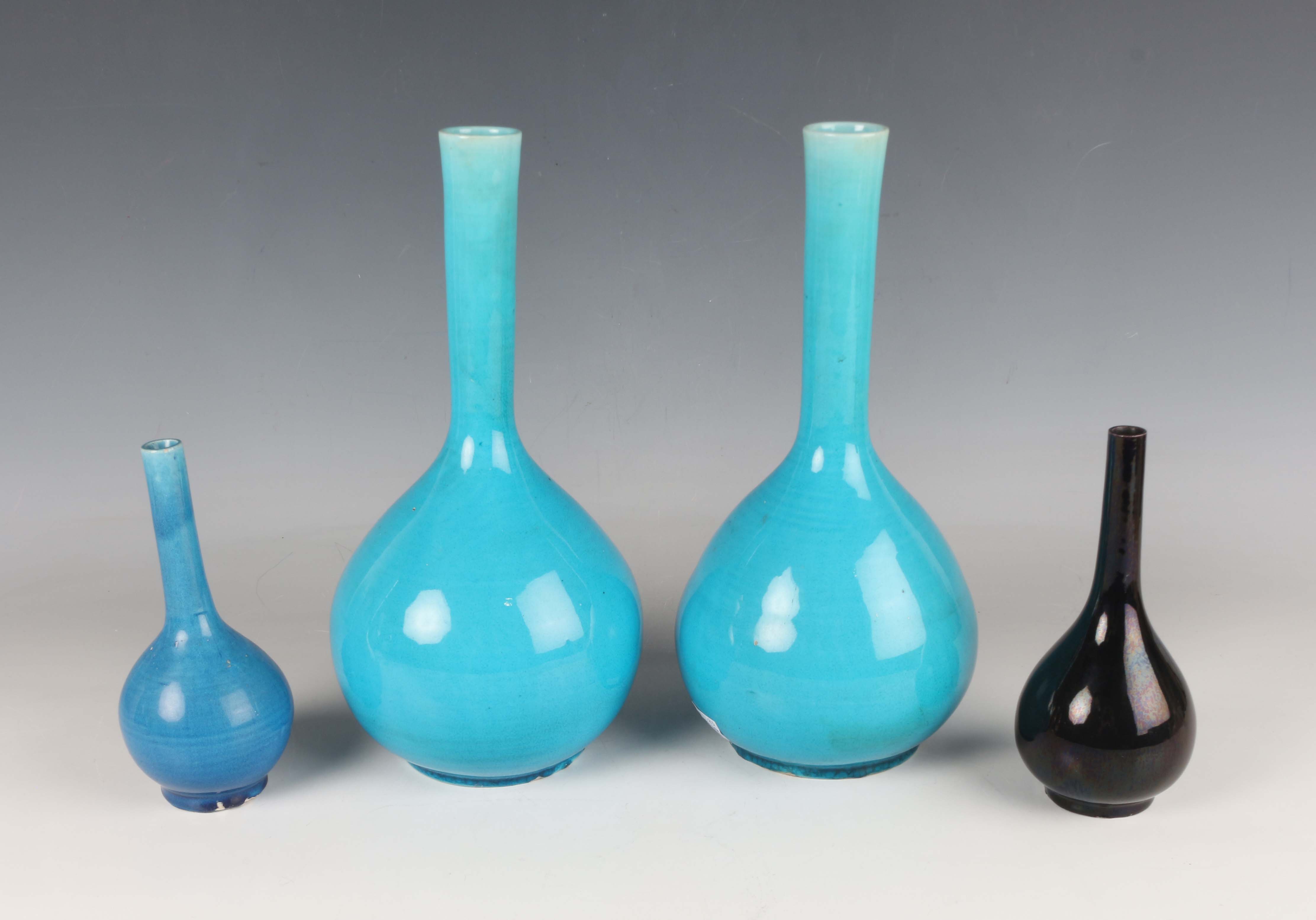 A pair of Chinese turquoise glazed porcelain bottle vases, late Qing dynasty, each with globular body and slightly tapered slender cylindrical neck, height 25.5cm, together with a similar smaller turquoise glazed bottle vase, height 14.6cm, and a black glazed bottle vase, height 15cm (minor faults).
